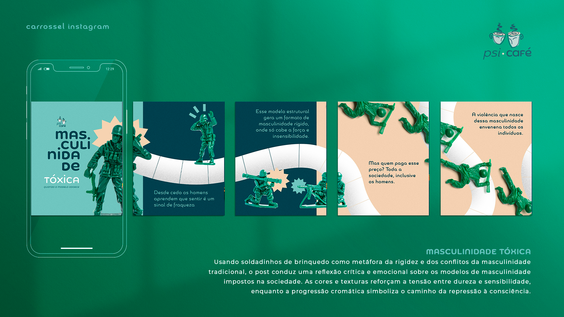 No carrossel “Masculinidade Tóxica”, os soldadinhos de brinquedo são uma metáfora da rigidez e do conflito interno da masculinidade tida como tradicional. As cores e texturas reforçam a tensão entre controle e sensibilidade, enquanto a progressão cromática — do azul ao bege — simboliza o caminho da repressão à consciência. O design atua como pensamento visual, conduzindo uma reflexão crítica e emocional sobre os modelos masculinos socialmente impostos. https://www.instagram.com/p/DKad6fESMDz/?img_index=1