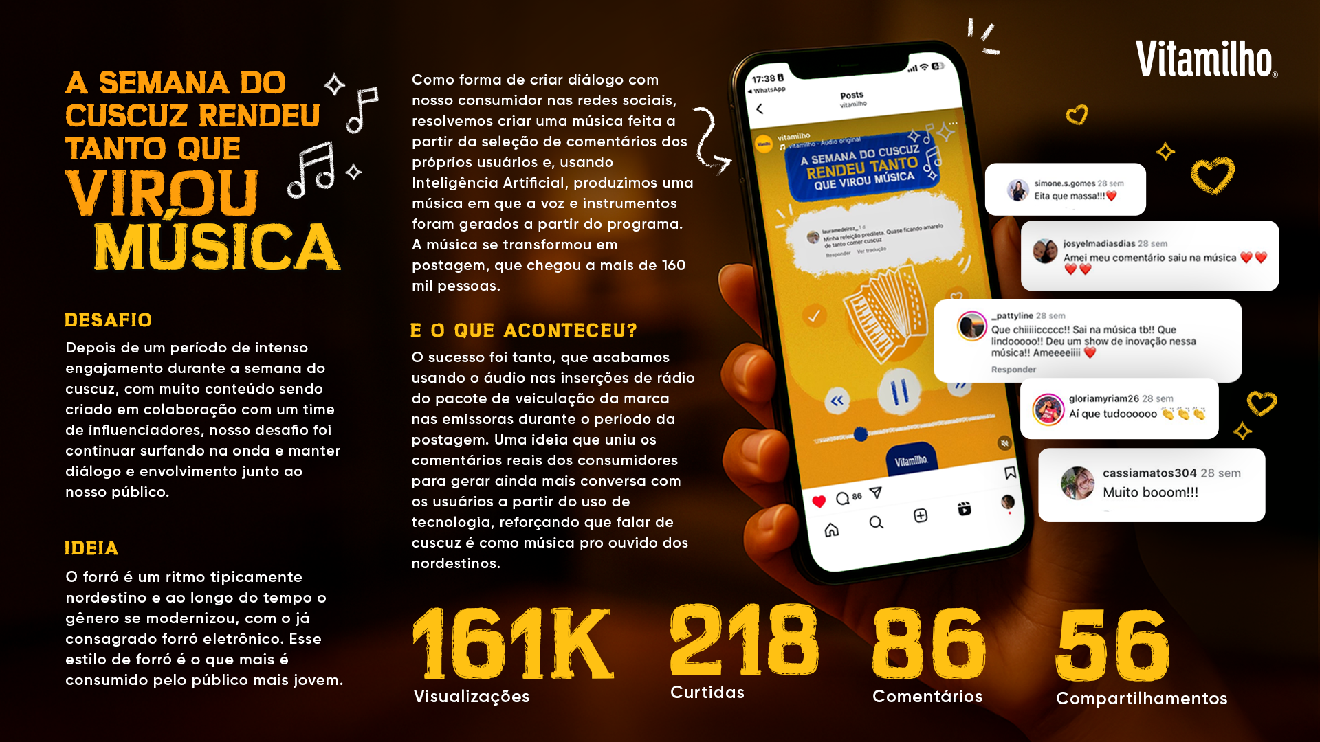 O forró é um ritmo tipicamente nordestino e ao longo do tempo o gênero se modernizou, com o já consagrado forró eletrônico. Esse estilo de forró é o que mais é consumido pelo público mais jovem. Como forma de criar diálogo com nosso consumidor nas redes sociais, resolvemos criar uma música feita a partir da seleção de comentários dos próprios usuários e, usando Inteligência Artificial, produzimos uma música em que a voz e instrumentos foram gerados a partir do programa. A música se transformou em postagem, que chegou a mais de 160 mil pessoas. O sucesso foi tanto, que acabamos usando o áudio nas inserções de rádio do pacote de veiculação da marca nas emissoras durante o período da postagem. Uma ideia que uniu os comentários reais dos consumidores para gerar ainda mais conversa com os usuários a partir do uso de tecnologia, reforçando que falar de cuscuz é como música pro ouvido dos nordestinos.
