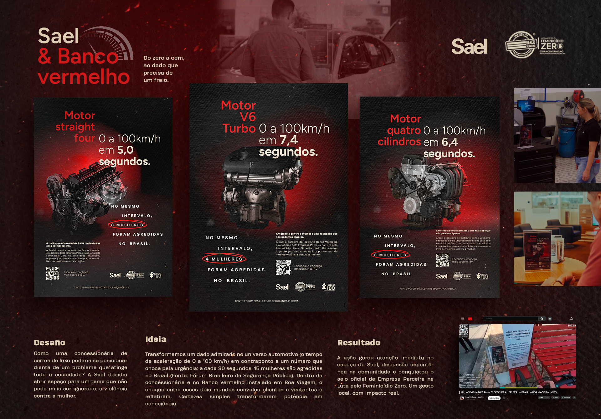 Na publicidade automotiva, o texto costuma acelerar junto com o carro. Fala de potência, desempenho, velocidade. Mas nesta campanha para a Sael, o texto fez o oposto: freou. A ideia nasceu de um paradoxo simples e contundente. “Todo apaixonado por carros conhece o dado que mais chama atenção: o de 0 a 100. Mas há dados que não deveriam correr tanto.” A partir dessa linha, o texto transformou um símbolo de performance em alerta social. As palavras conduzem o olhar até a virada de sentido, quando o número de aceleração dá lugar ao número de agressões sofridas por mulheres no mesmo intervalo. A escrita é limpa, direta e silenciosa. Não há adjetivos nem apelos, apenas a pausa necessária para pensar. O texto não explica, provoca. E ao provocar, cumpre o papel de toda boa ideia: usar o verbo certo para fazer o mundo andar em outra direção.