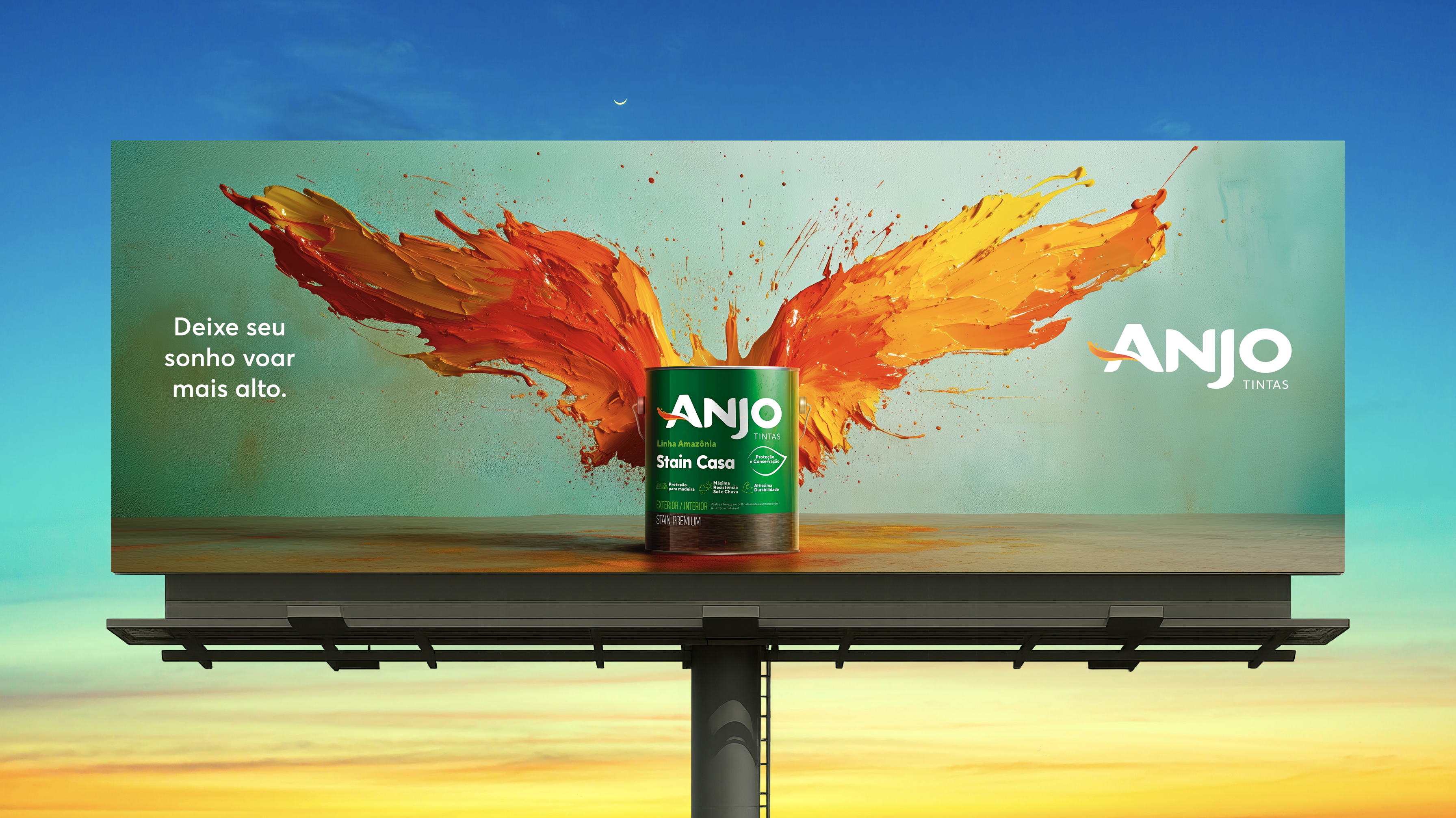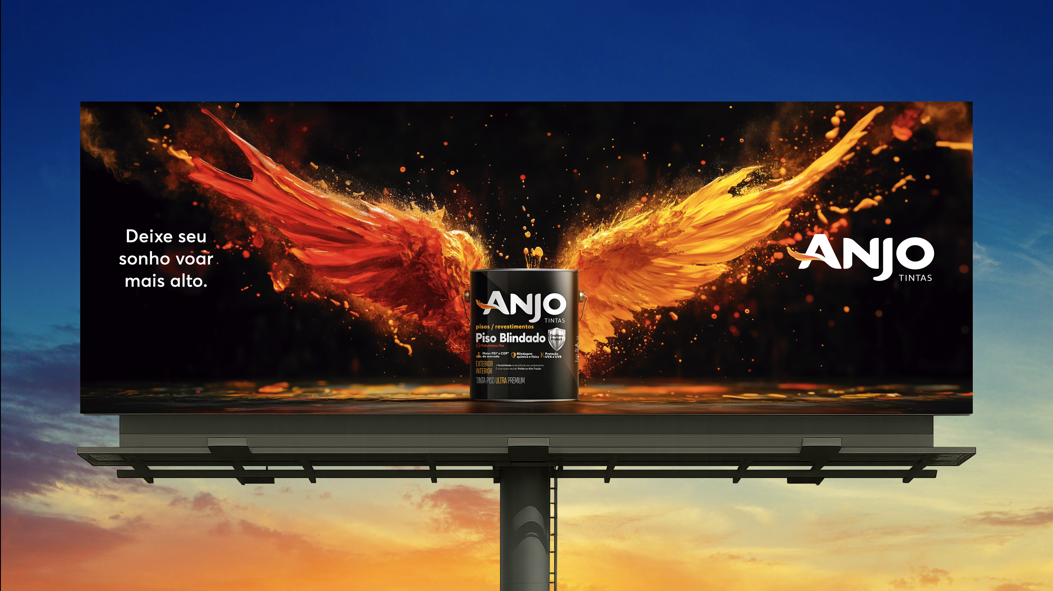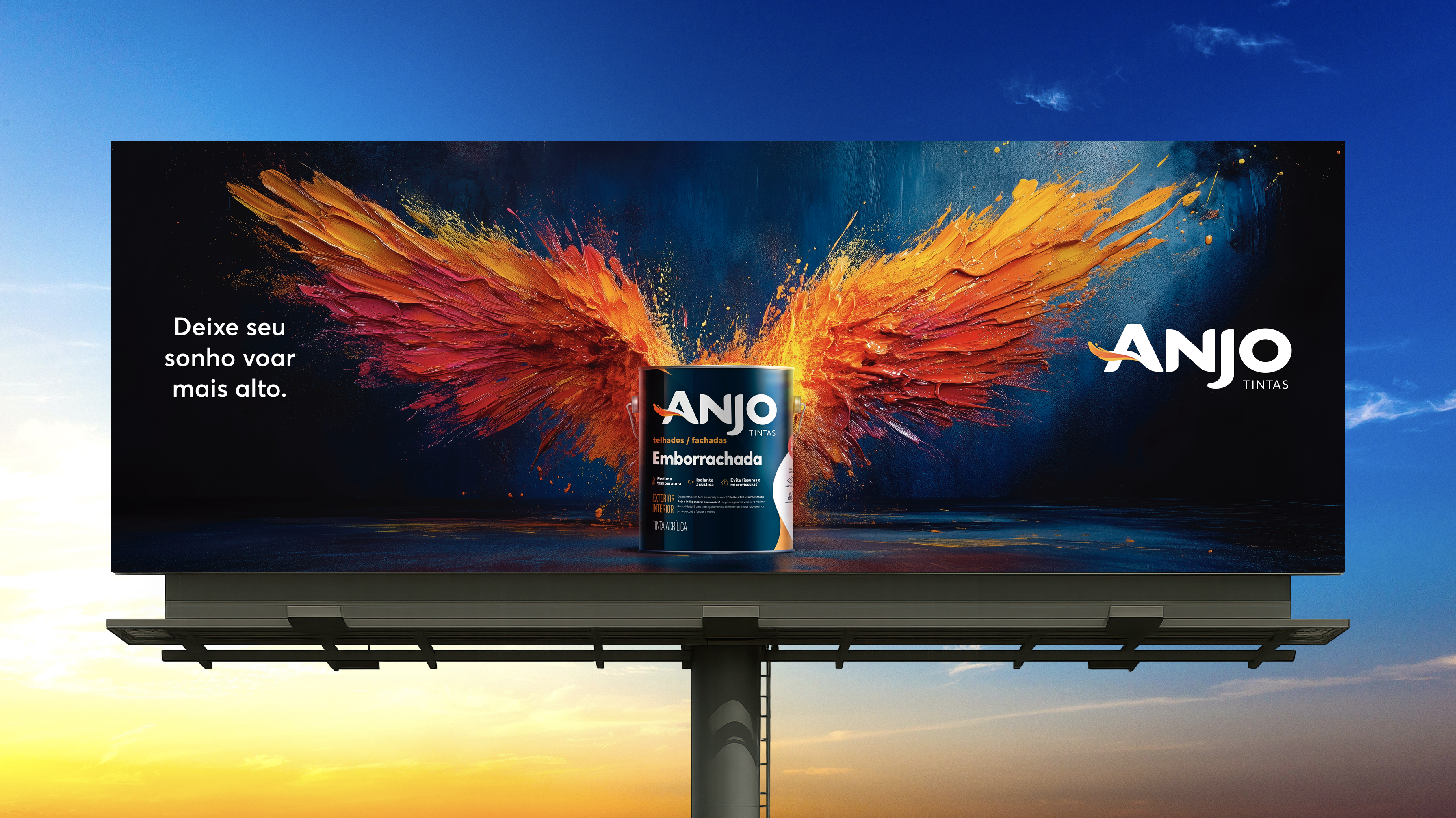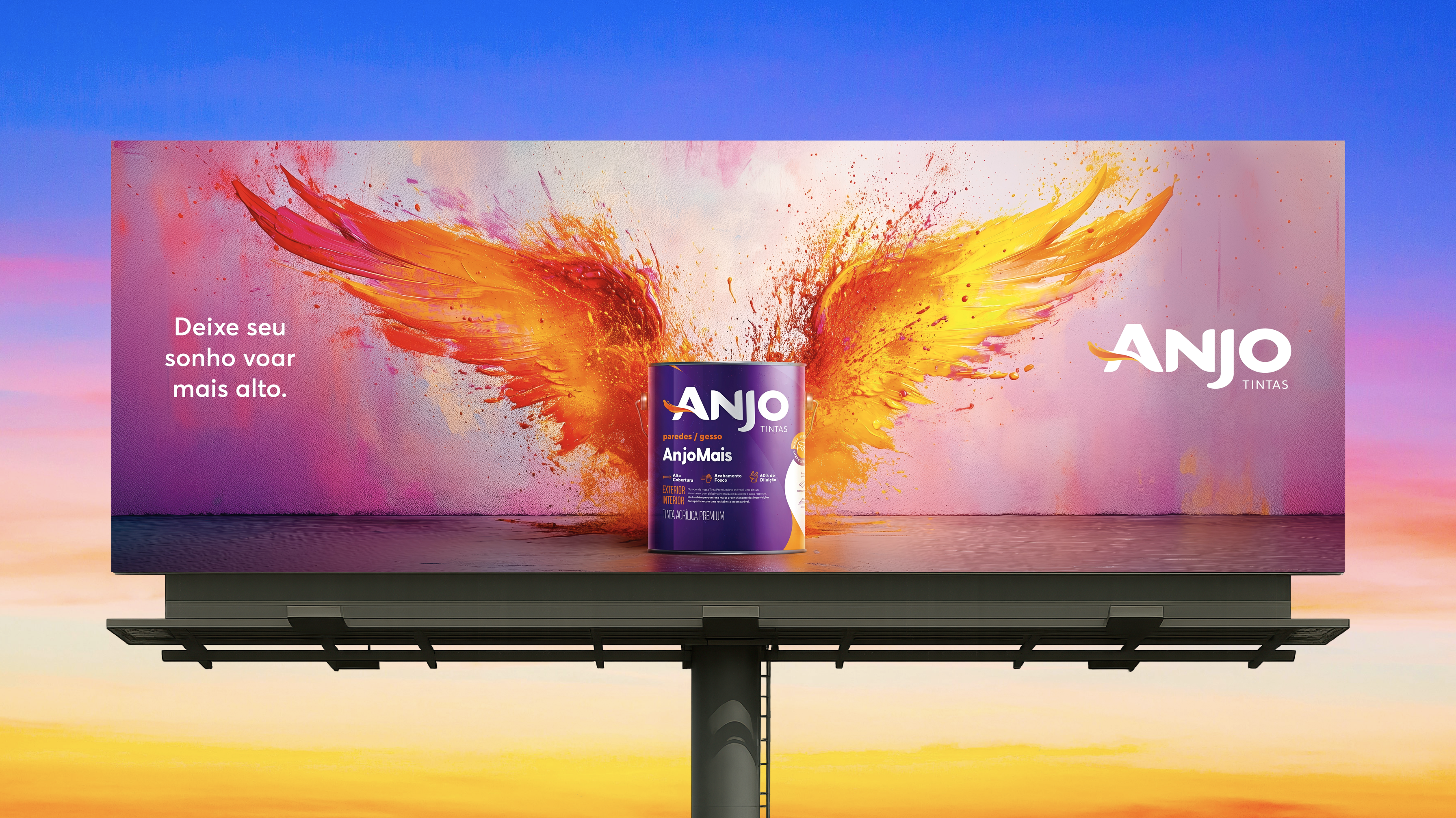 A campanha da Anjo Tintas traduz em uma imagem icônica o poder transformador da cor. No outdoor, asas formadas pela explosão de tintas com as cores da marca, simbolizam liberdade, transformação, inovação e criatividade, valores que impulsionam sonhos a saírem do papel, seja em reformas do lar ou grandes empreendimentos. Com uma direção de arte impactante e um título inspirador, a peça usa com inteligência a mídia OOH. O conceito visual das asas conecta-se diretamente ao nome da marca, criando uma associação emocional imediata e reforçando que o produto tem o poder de transformar ambientes e histórias. A campanha transformou o outdoor em um símbolo, aproximando a marca do consumidor com emoção, beleza e significado.