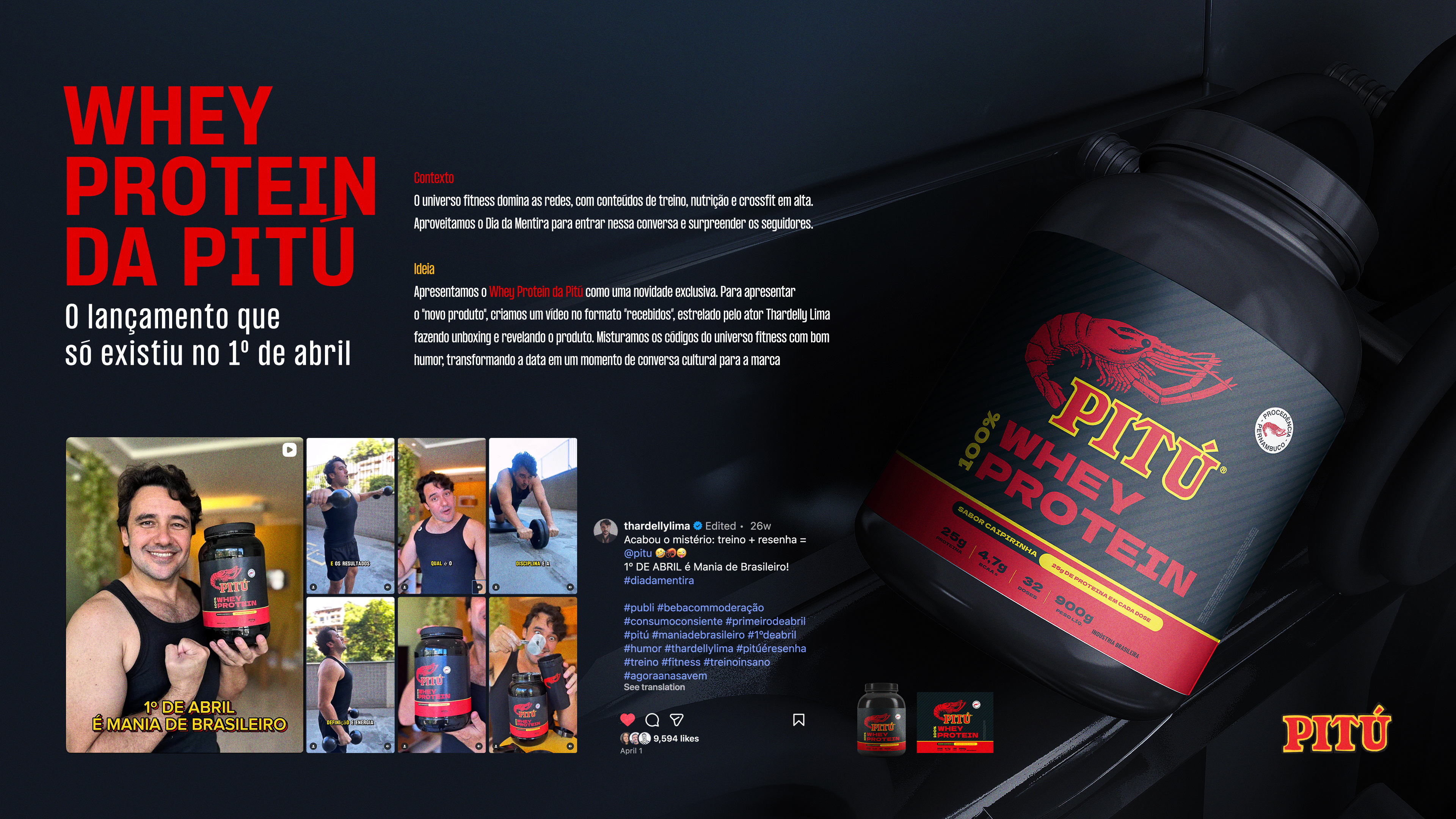 O universo fitness domina as redes, com conteúdos de treino, nutrição e crossfit em alta. Aproveitamos o Dia da Mentira para entrar nessa conversa e surpreender os seguidores com um lançamento especial da Pitú. Apresentamos o Whey Protein da Pitú como uma novidade exclusiva. Para apresentar o "novo produto", criamos um vídeo no formato “recebidos”, estrelado pelo ator Thardelly Lima fazendo unboxing e revelando o produto. Misturamos os códigos do universo fitness com bom humor, transformando a data em um momento de conversa cultural para a marca.