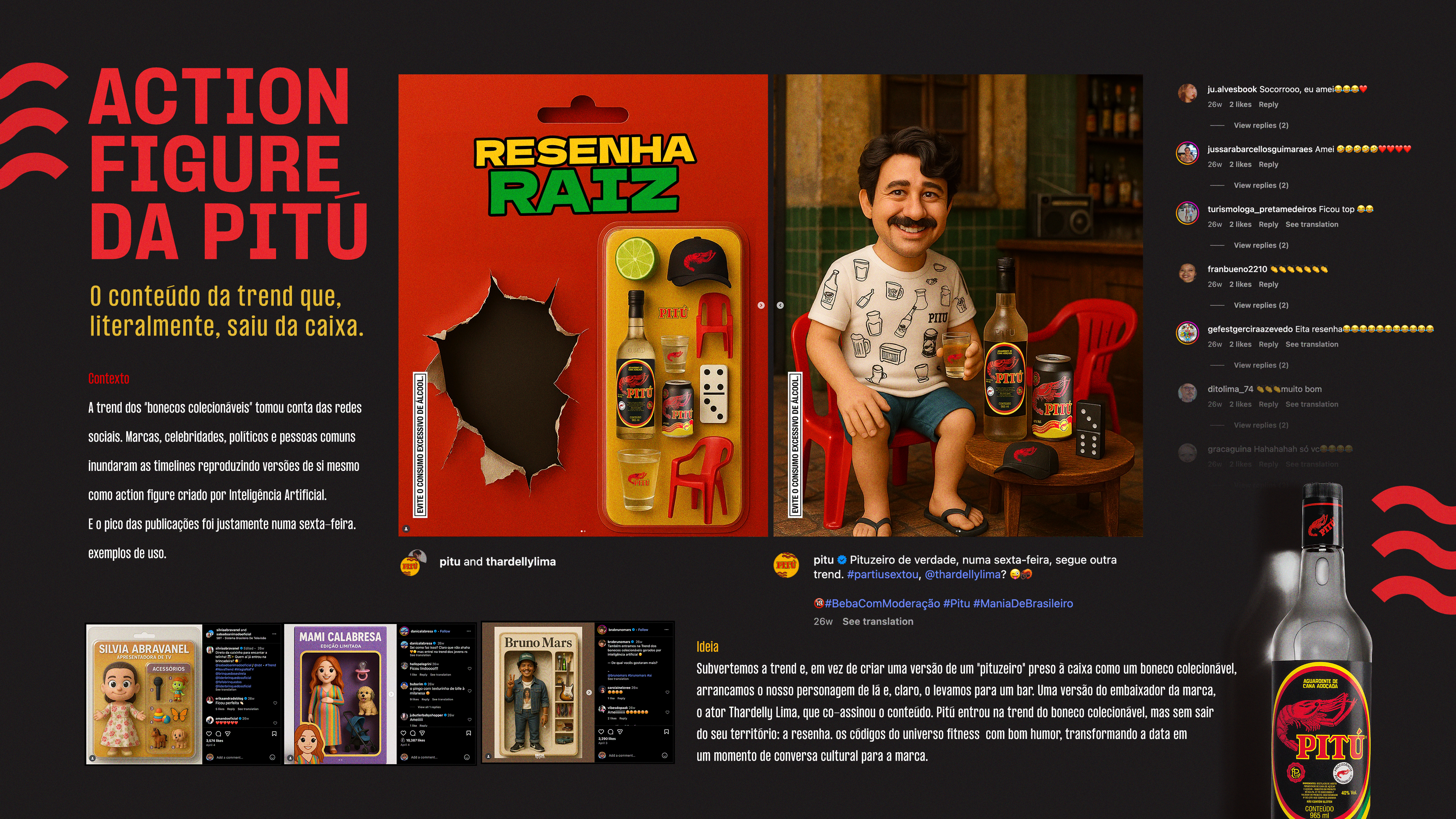 A trend dos “bonecos colecionáveis” tomou conta das redes sociais. Marcas, celebridades, políticos e pessoas comuns inundaram as timelines reproduzindo versões de si mesmo como action figure criado por Inteligência Artificial. E o pico das publicações foi justamente numa sexta-feira. exemplos de uso Subvertemos a trend e, em vez de criar uma versão de um "pituzeiro" preso à caixa como um boneco colecionável, arrancamos o nosso personagem de lá e, claro, o levamos para um bar. Uma versão do embaixador da marca, o ator Thardelly Lima, que co-assinou o conteúdo. Pitú entrou na trend do boneco colecionável, mas sem sair do seu território: a resenha.