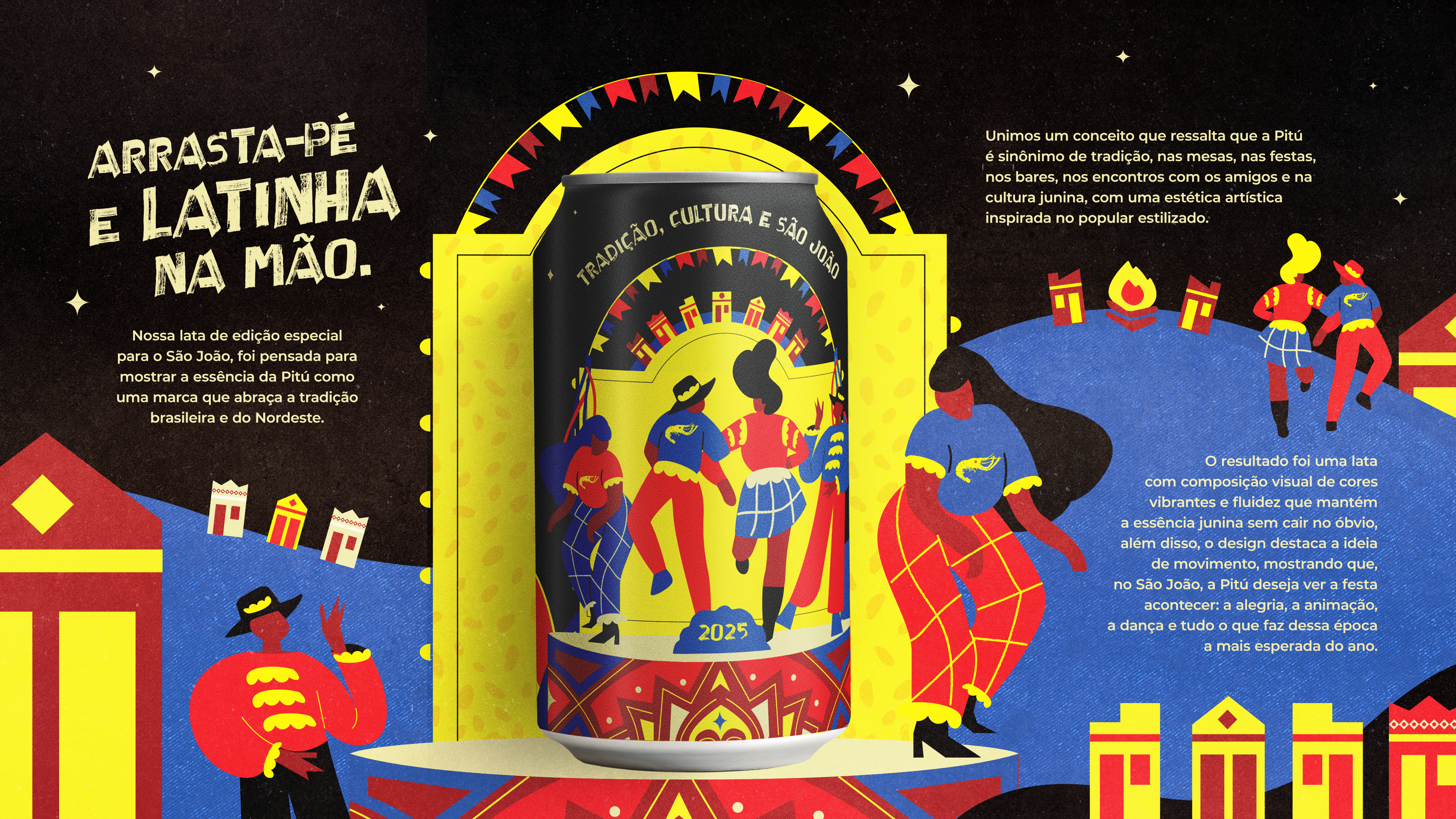 Unimos um conceito que ressalta que a Pitú é sinônimo de tradição, nas mesas, nas festas, nos bares, nos encontros com os amigos e na cultura junina, com uma estética artística inspirada no popular estilizado. O resultado foi uma lata com composição visual de cores vibrantes e fluidez que mantém a essência junina sem cair no óbvio, além disso, o design destaca a ideia de movimento, mostrando que, no São João, a Pitú deseja ver a festa acontecer: a alegria, a animação, a dança e tudo o que faz dessa época a mais esperada do ano.